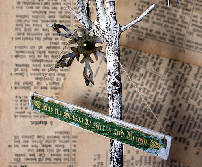 I'm by no means a gardening wiz. Quite the contrary, I kill every plant I get in my hands, or onto my windowsill, that is. Like this olive tree. When the last leaf fell, and I realized that it probably hadn't got any water for at least a month, a little idea came to me. Why not make something funny out of it instead of throwing it away? So, I painted the whole tree white, put it in a wooden spool and sprayed it with Glimmer Mist Pearl to make it shimmer like a vampire in sunlight (yeah, I saw Breaking Dawn last night) Then I decorated it with snowflakes punched out of Graphic 45 papers and a chipboard sign, and now I can still keep it on my windowsill even though it's dead. Pretty nice, huh?So, now I can keep killing plants without feeling bad about it... LOL. Everything I used (except for the tree itself) can be found at Scraplagret.